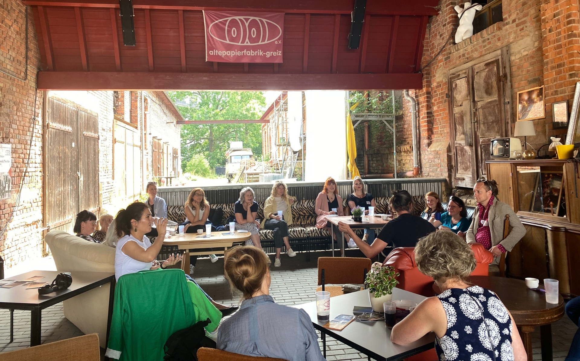 Am zweiten Tag statten wir der „Alten Papierfabrik“ in Greiz einen Besuch ab. Auf die Initiative einiger weniger Jugendlicher Anfang des Jahrtausends, die sich die alten Fabrikhallen angeeignet hatten, um Technopartys zu feiern, hat sich hier in tausenden von Arbeitsstunden eine offene Anlaufstelle für Bands, Künstlerinnen und Initiativen entwickelt – ein kreativer Freiraum, der ebenfalls überregional bekannt ist. Mit einer Führung vom professionell ausgestatteten Konzertraum über den Keller bis zum Dach der Fabrik eröffnet Vorstandsvorsitzender Peter Schmidt den Vormittag. Er berichtet von den Anfängen, der vollumfänglich auf Ehrenamt basierenden Organisationsstruktur vor Ort und von den handwerklichen Talenten der Aktiven, die es ermöglichen, dass das Gebäude Schritt für Schritt saniert werden kann. Die „Pappe“, ist wichtig für eine offene Kultur in Greiz, berichtet Steffen Magdeburg von der Wirtschaftsförderung. Daher unterstützt die Stadt im Hinblick auf günstige Pachtbedingungen. Auch Martina Högger vom Landratsamt Greiz betont die zivilgesellschaftliche Bedeutung des Ortes, auch jenseits der eignen Veranstaltungsmauern: „Ohne die Pappe läuft nichts in Greiz“. Die Bedeutung des Ortes für die Stadt und Region zeigt sich nicht zuletzt darin, dass er ein Grund ist, für Menschen wieder zurückzukehren.