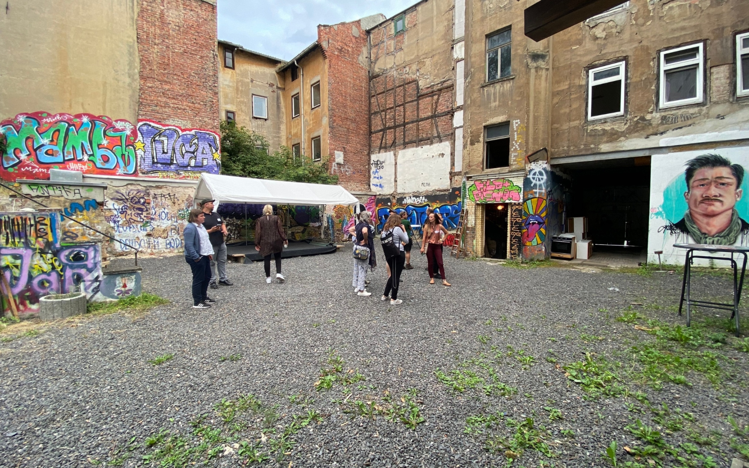 Im Anschluss besuchen wir den Pößnecker Alternative Freiraum e.V., kurz „PAF“, ein selbstorganisiertes Jugend- und Kulturzentrum das 2011 aus einer zivilgesellschaftlichen Initiative gegen das damals von Neonazis betriebene Schützenhaus entstanden ist. Inzwischen hat sich aus dem unscheinbar am Stadtrand gelegenen ehemaligen Leerstand ein intergenerationaler Zufluchtsort für Menschen aus Pößneck und ein überregional bekannter Veranstaltungsort entwickelt. Der PAF ist Safe Space, kultureller Freiraum und Anlaufstelle für Jugendliche, auch aus schwierigen Verhältnissen, wie uns Martin Rech, Vereinsvorsitzender erzählt. Der Verein engagiert sich zudem in der Demokratiearbeit und vernetzt sich mit Kulturaktiven der Stadt. Der durch bundesweite Auszeichnungen anerkannte Ort arbeitet daran, auch von der Stadt Pößneck selbst als wichtiger Akteur für Jugendliche wahrgenommen zu werden. Erfolgt eine finanzielle Unterstützung durch die Stadt, wäre eine dringend benötigte Sozialarbeiterstelle in Aussicht. Im Gegensatz zum Kulturkollektiv Goetheschule ist die Zukunft des PAF allerdings ungewiss, denn für die kommende Landesgartenschau 2028 soll das Gebäude abgerissen werden. Christian Horn, Kulturdirektor der Stadt Erfurt, plädiert für eine aktive kulturpolitische Arbeit des Freiraums, um die Stadt von der Notwendigkeit des Ortes zu überzeugen.