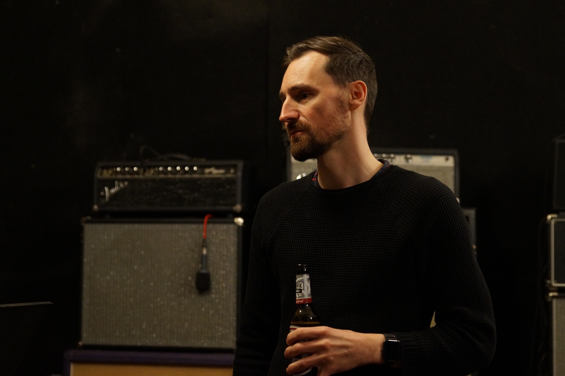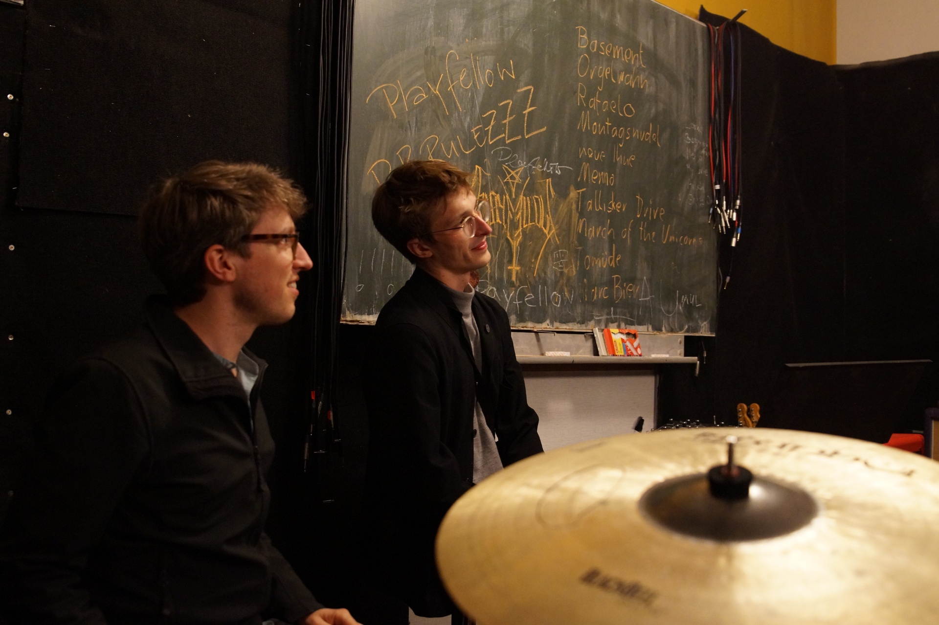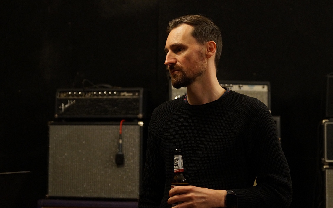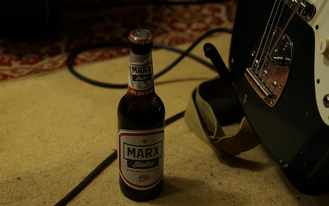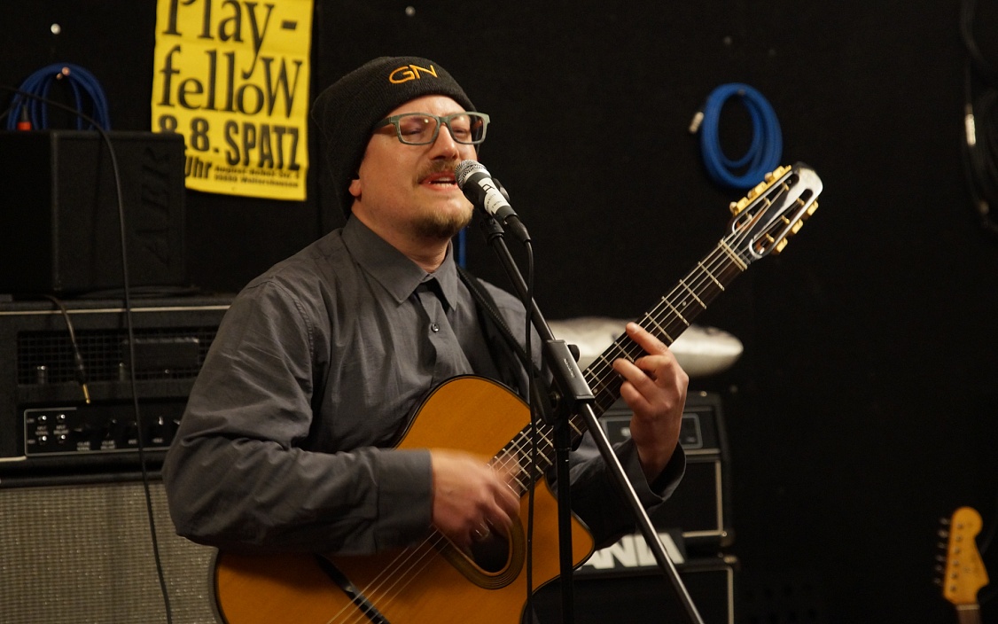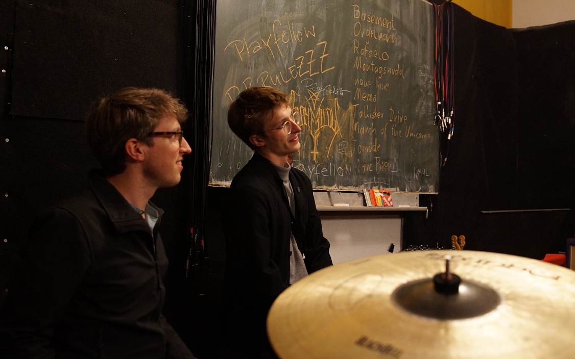 Dann ist Gitarrist Fabian Böttcher fertig mit dem Stimmen und legt einfach los. Wie Thomas hat auch er einen „Brotjob“, er ist Hörgeräteakustiker. Wir merken: Die beiden kennen sich schon lange.