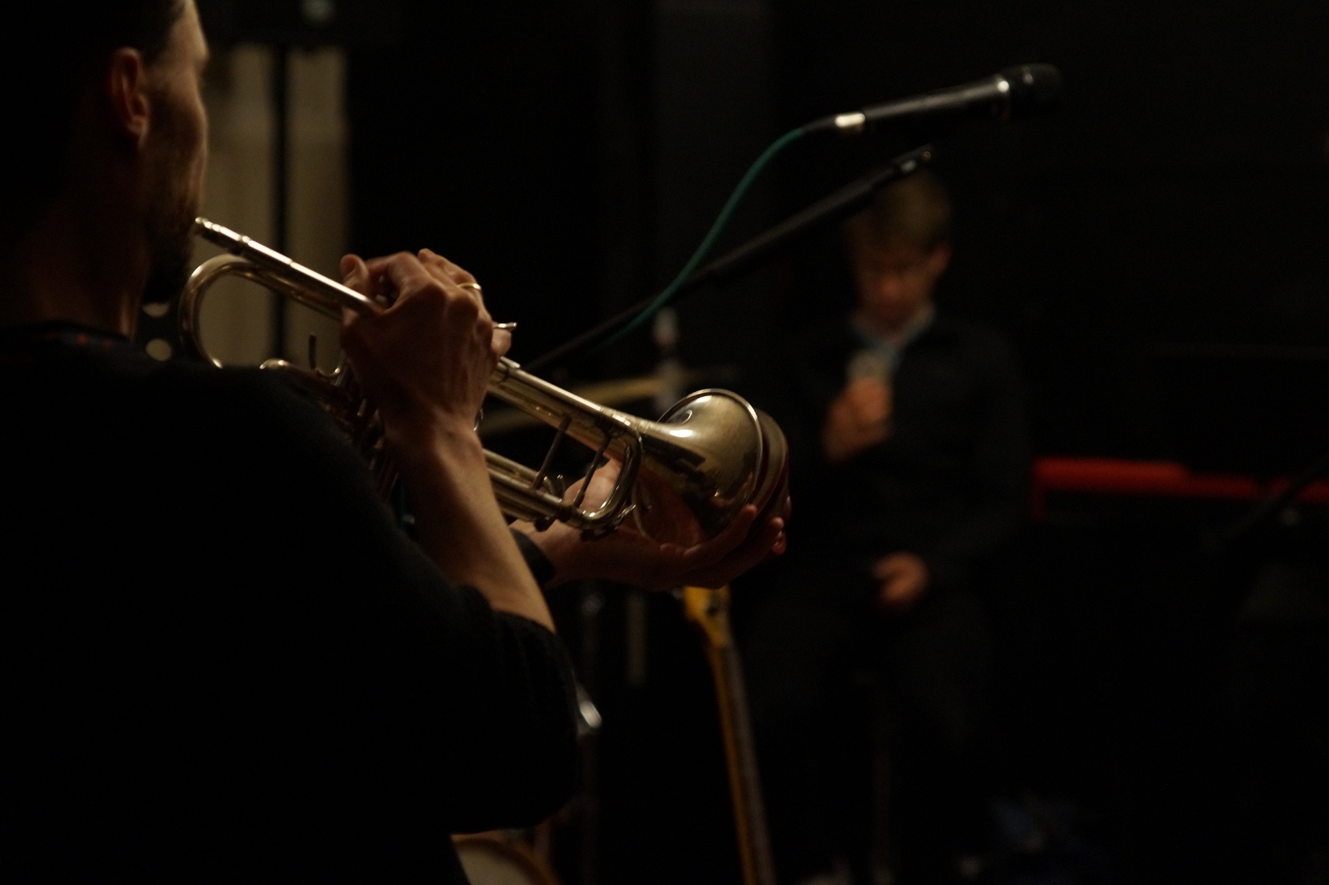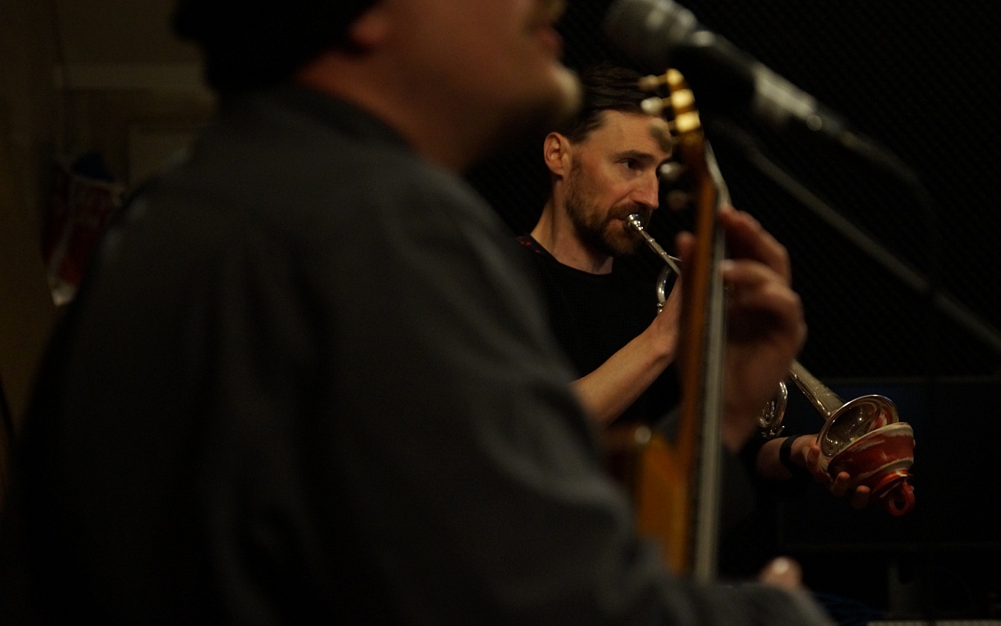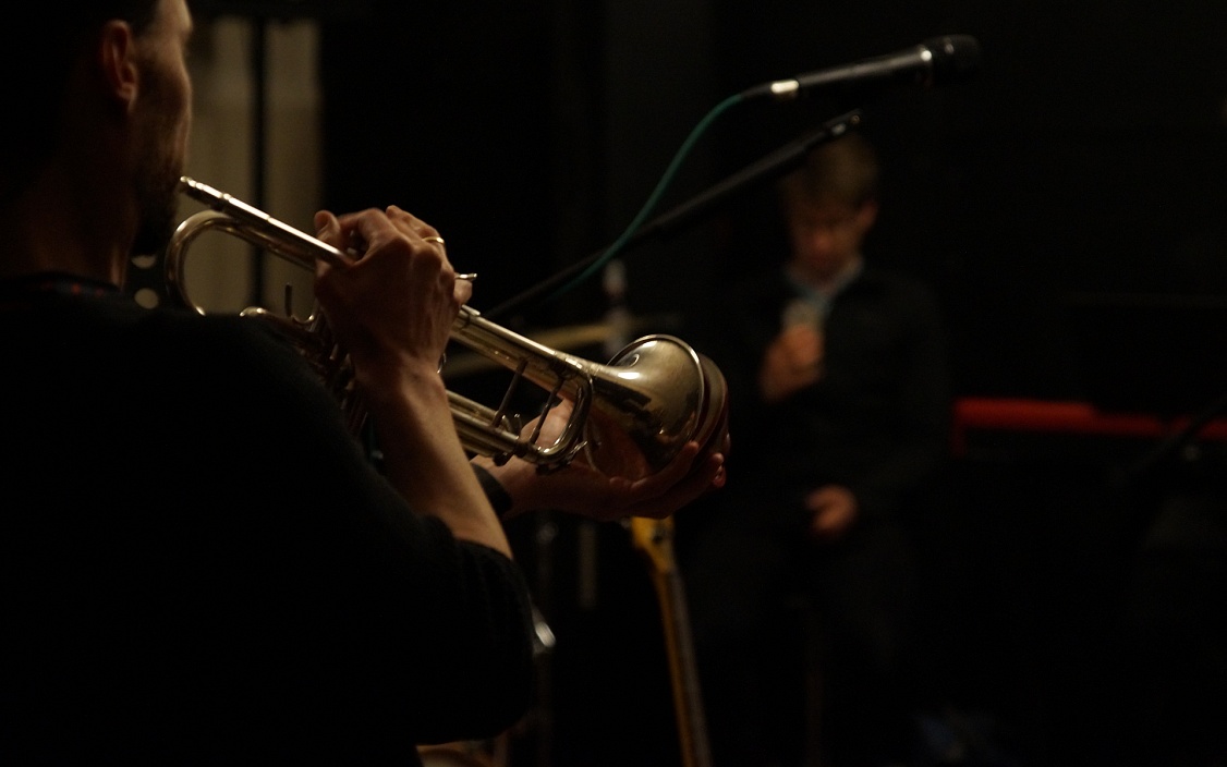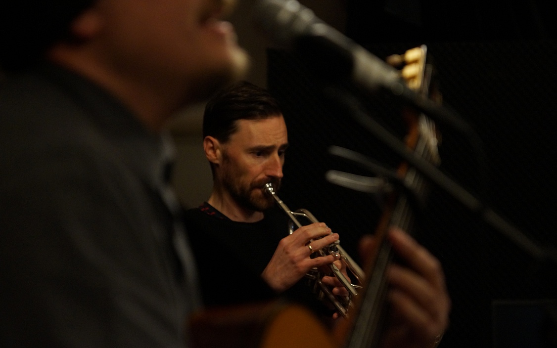 Thomas schnappt sich Trompete und Dämpfer, hört ein paar Takte zu und steigt dann ein. Als Duo spielen sie vor allem Material von Singer-Songwritern, über das sie improvisieren.