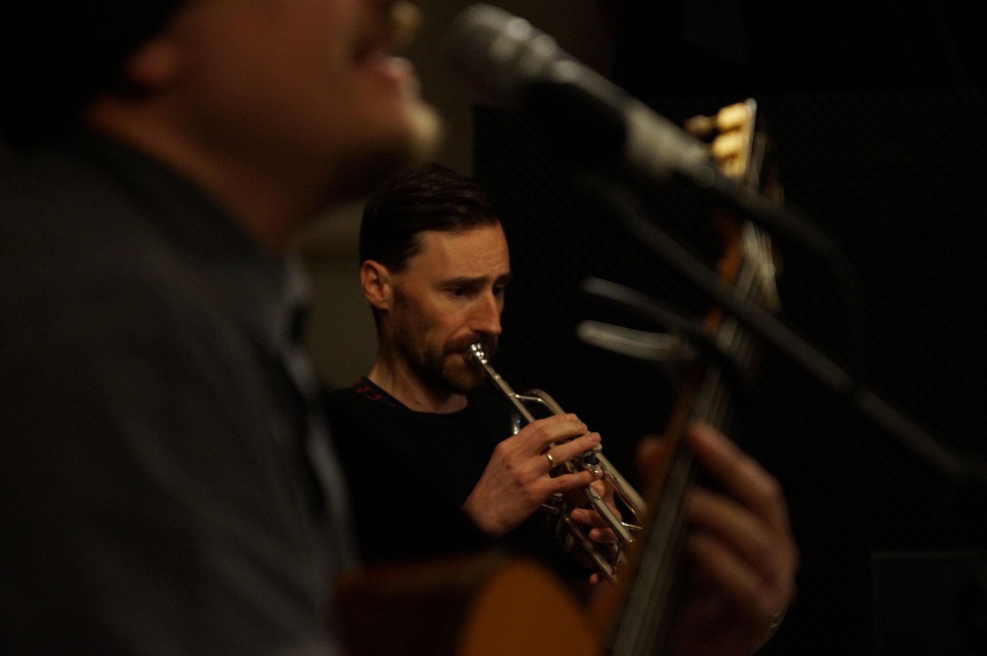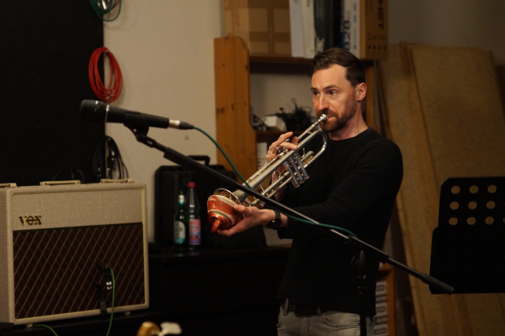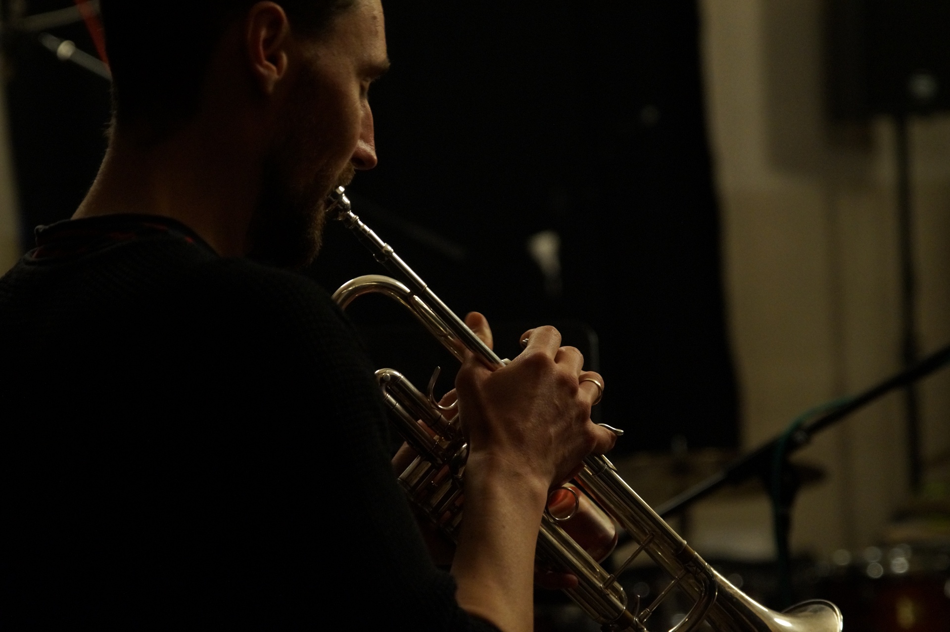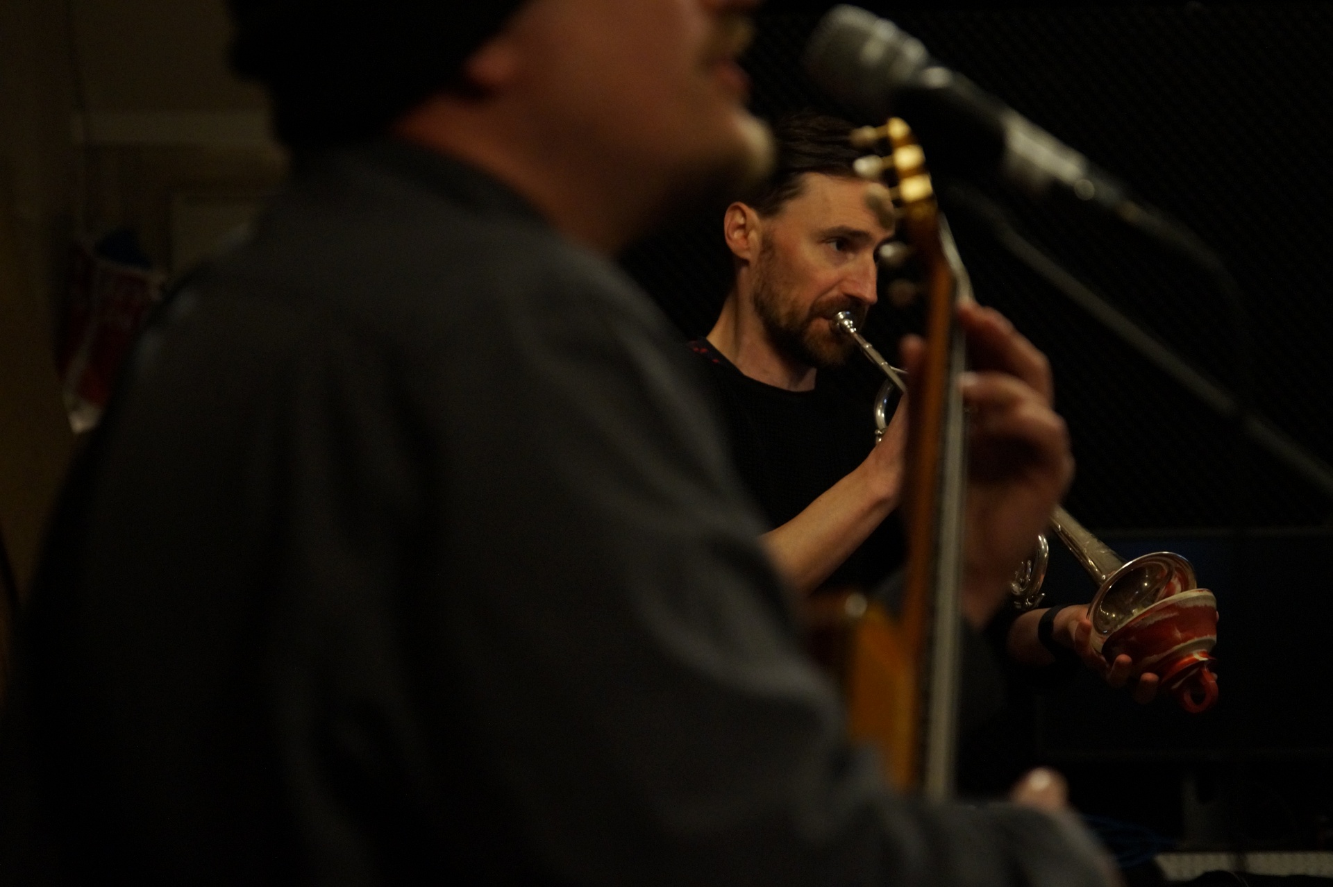Thomas schnappt sich Trompete und Dämpfer, hört ein paar Takte zu und steigt dann ein. Als Duo spielen sie vor allem Material von Singer-Songwritern, über das sie improvisieren.
