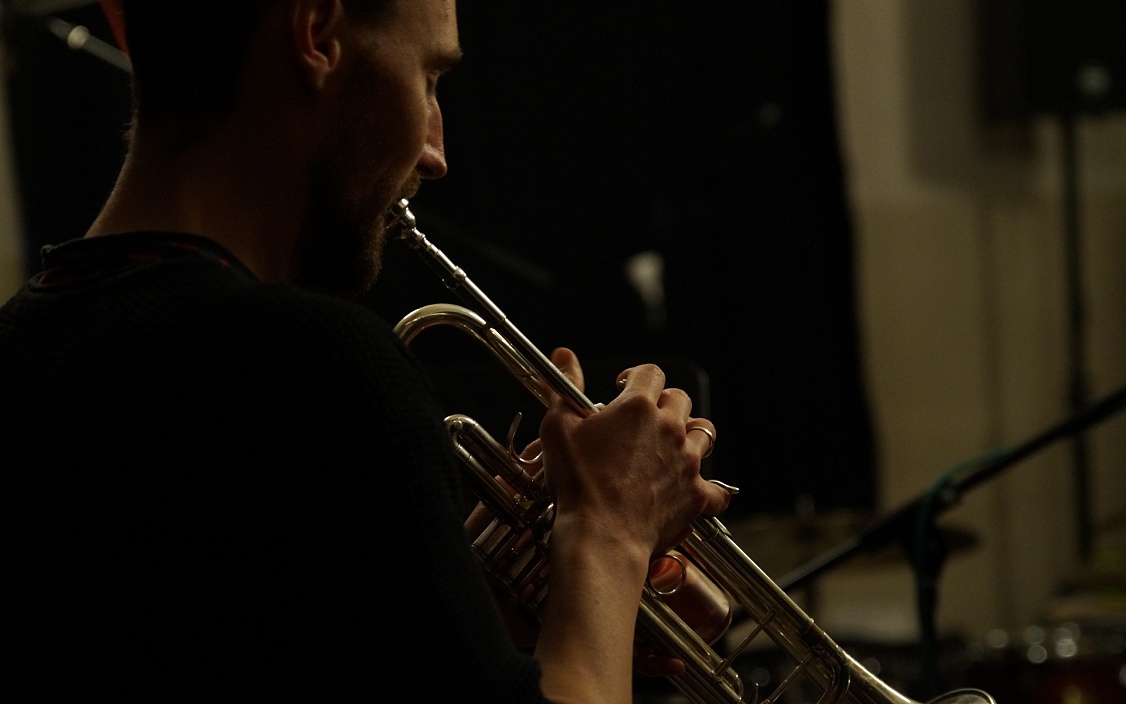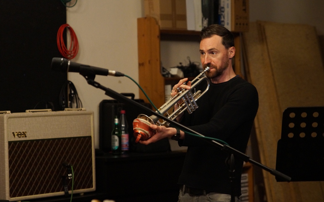 Was wir wohl gleich zu hören kriegen werden? Es ist das erste Zusammentreffen von künstlerischem Leiter, Dramaturg und Trompeter in diesem Projekt. Die Spannung ist allen anzumerken.