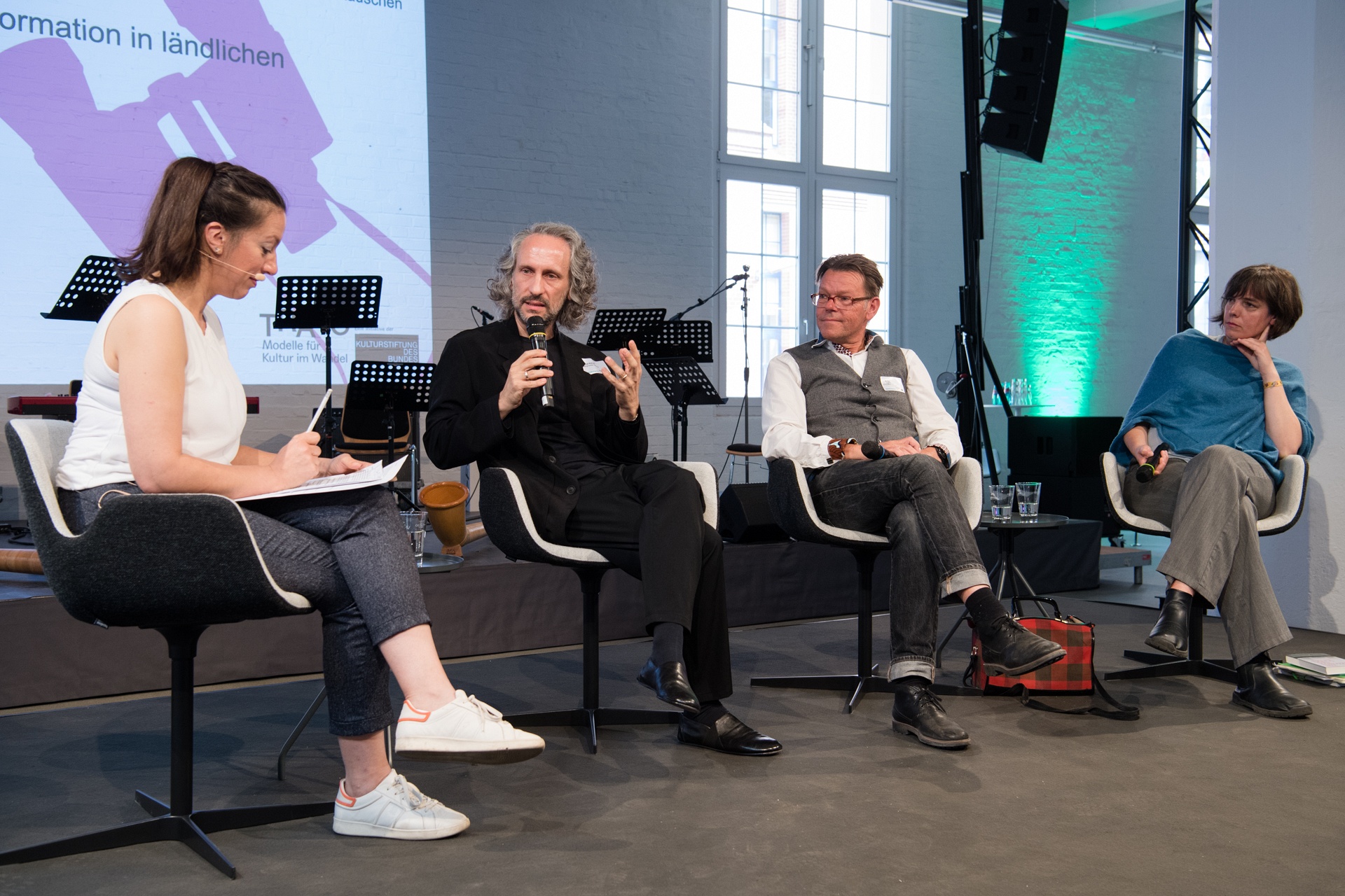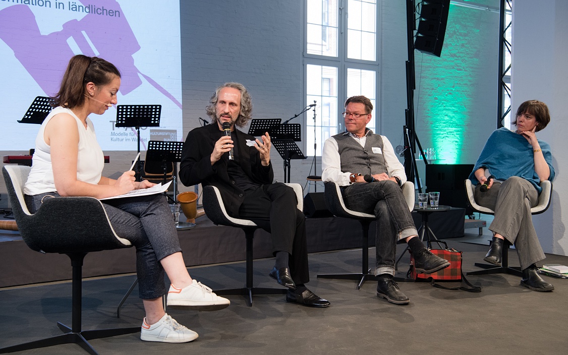 Podium "Kultur gestaltet Veränderung?", v.l.n.r: Moderatorin Ellen Schweda, Prof. Daniel Kühnel, Ton Matton, Dr. Julia Gabler.