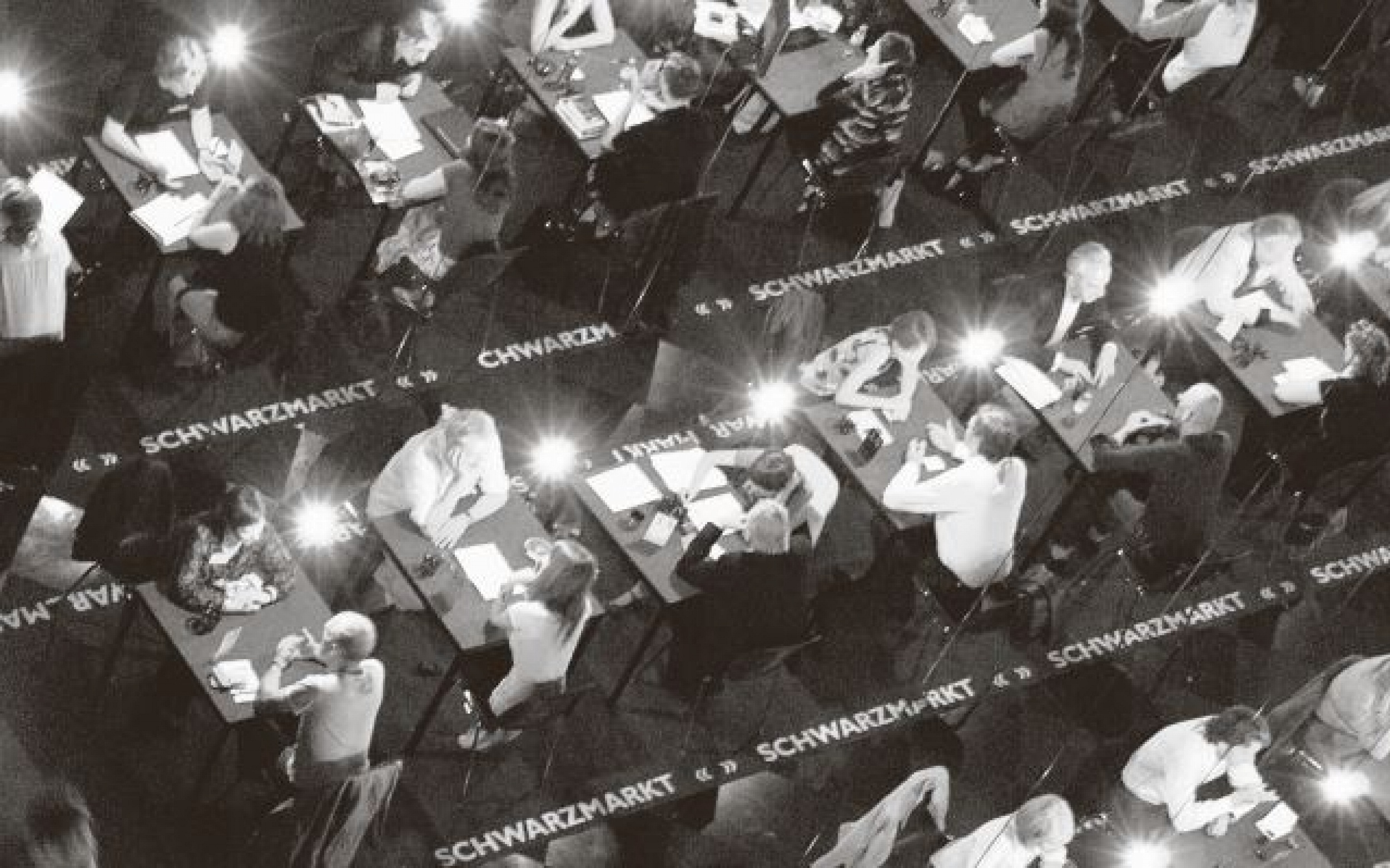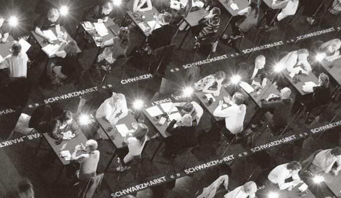 Jeder SCHWARZMARKT FÜR NÜTZLICHES WISSEN UND NICHT- WISSEN präsentiert ein spezifisches Thema mit Experten aus unterschiedlichsten Disziplinen. Die Installation imitiert Orte der Wissensvermittlung, wie das Archiv und den Lesesaal, und kombiniert diese mit Kommunikationssituationen wie sie vom Markt, der Börse oder vom Beratungsgespräch bekannt sind. Im Schwarzmarkt wird Wissen im Dialog und als Erzählung angeboten und verhandelt. In Halle bieten 60 Expertinnen in einer maschinisierten Arena, getaktet im Rhythmus administrierter Zeit, im Rausch der Simultanität und Kollektivität, ihr spezifisches Wissen an. Die Klienten des Schwarzmarkts können die Expertinnen für 30-minütige Einzelsitzungen buchen oder sich über das Schwarzmarktradio den Gesprächen zuschalten. Die Gespräche werden aufgezeichnet und können unter www.audio-archive.com abgerufen werden.