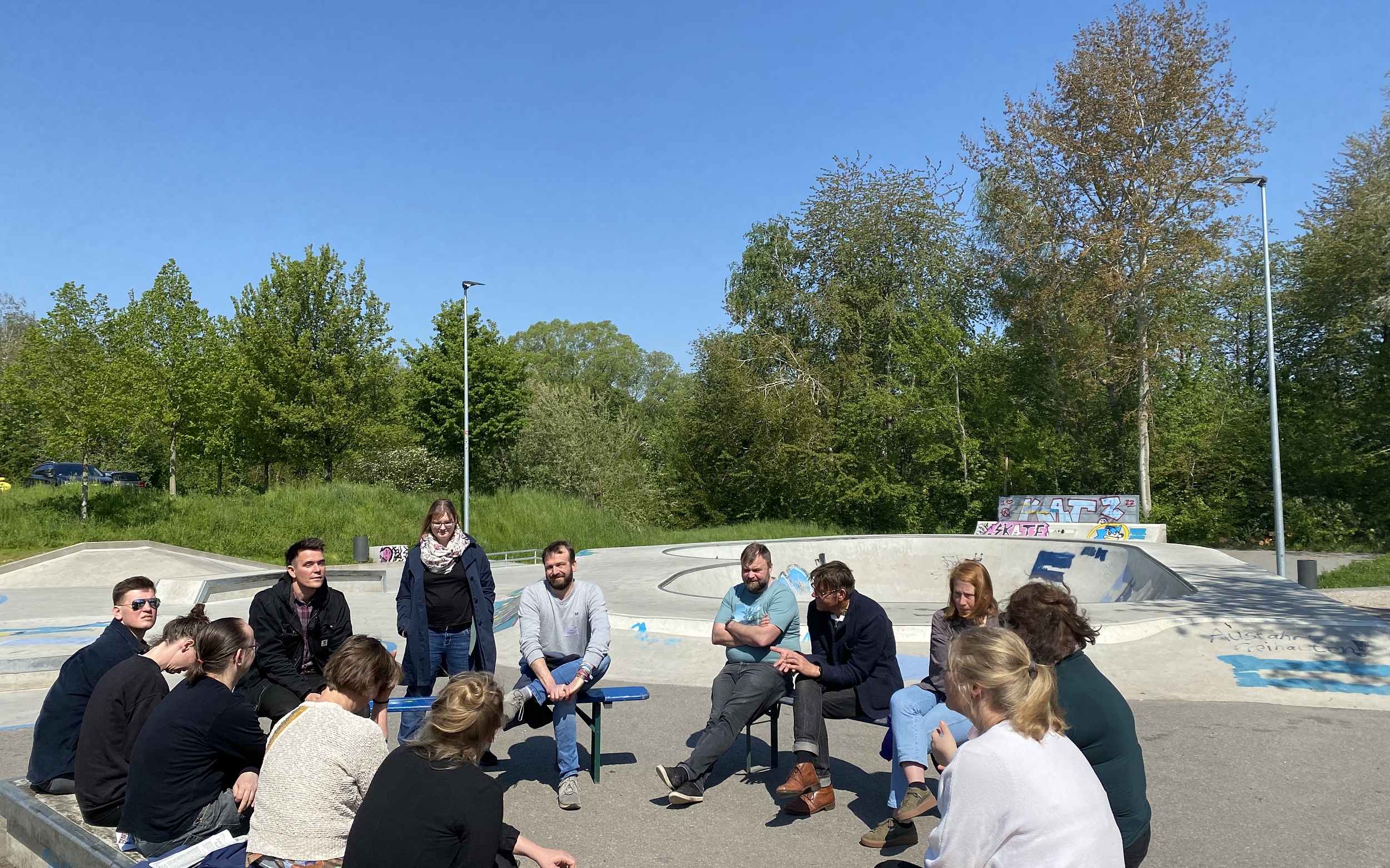 Die letzte Station der Reise war am zweiten Tag der Steinhaus Bautzen e.V., ein soziokulturelles Zentrum. Unter Beteiligung von Jugendlichen ist hier ein Skatepark entstanden, der inzwischen überregional bekannt ist und von vielen verschiedenen Gruppen genutzt wird. Im Gegensatz zu den beiden selbstverwalteten Projekten arbeiten die Jugendlichen hier mit dem Sozialarbeiter Benno Auras zusammen, der seine Aufgabe darin sieht, die Jugendlichen zu unterstützen, einen Ort zu schaffen, an den sie gerne zurückkehren. Dafür sei aus verschiedensten Gründen heraus kontinuierlich Betreuung notwendig, berichtet der Sozialarbeiter im Rahmen des abschließenden Reflexionsgespräches vor Ort auf dem Skateplatz, denn nur gemeinsam sei es möglich an der Ausbildung eines Demokratieverständnisses zu arbeiten.