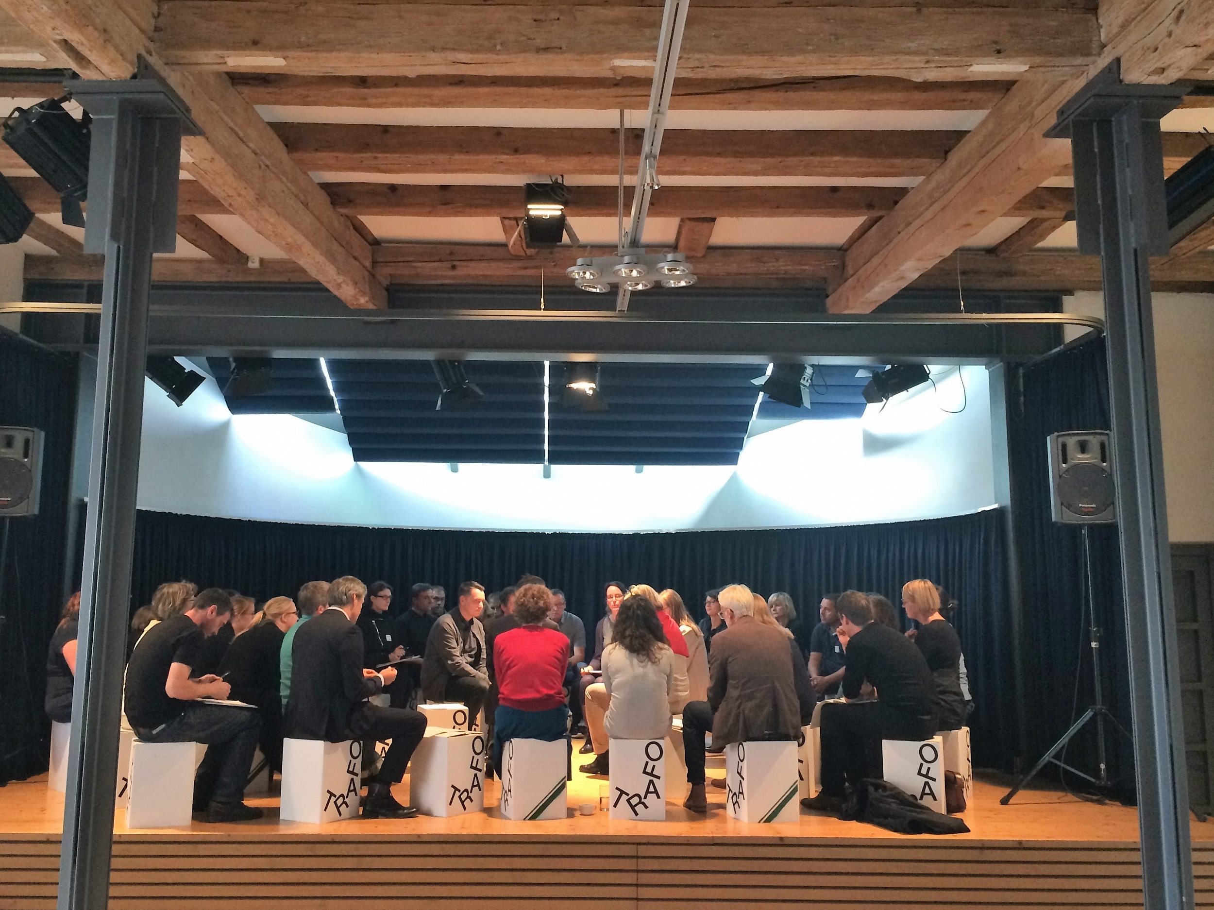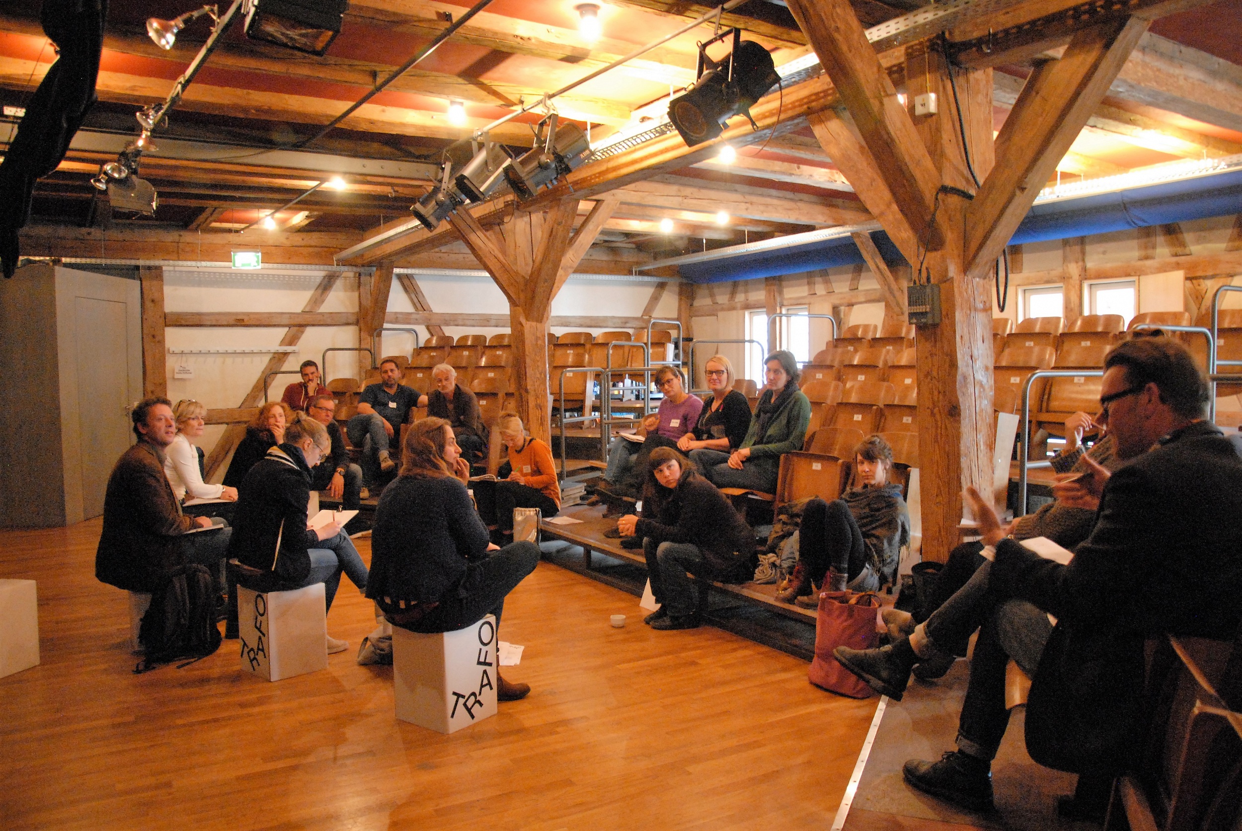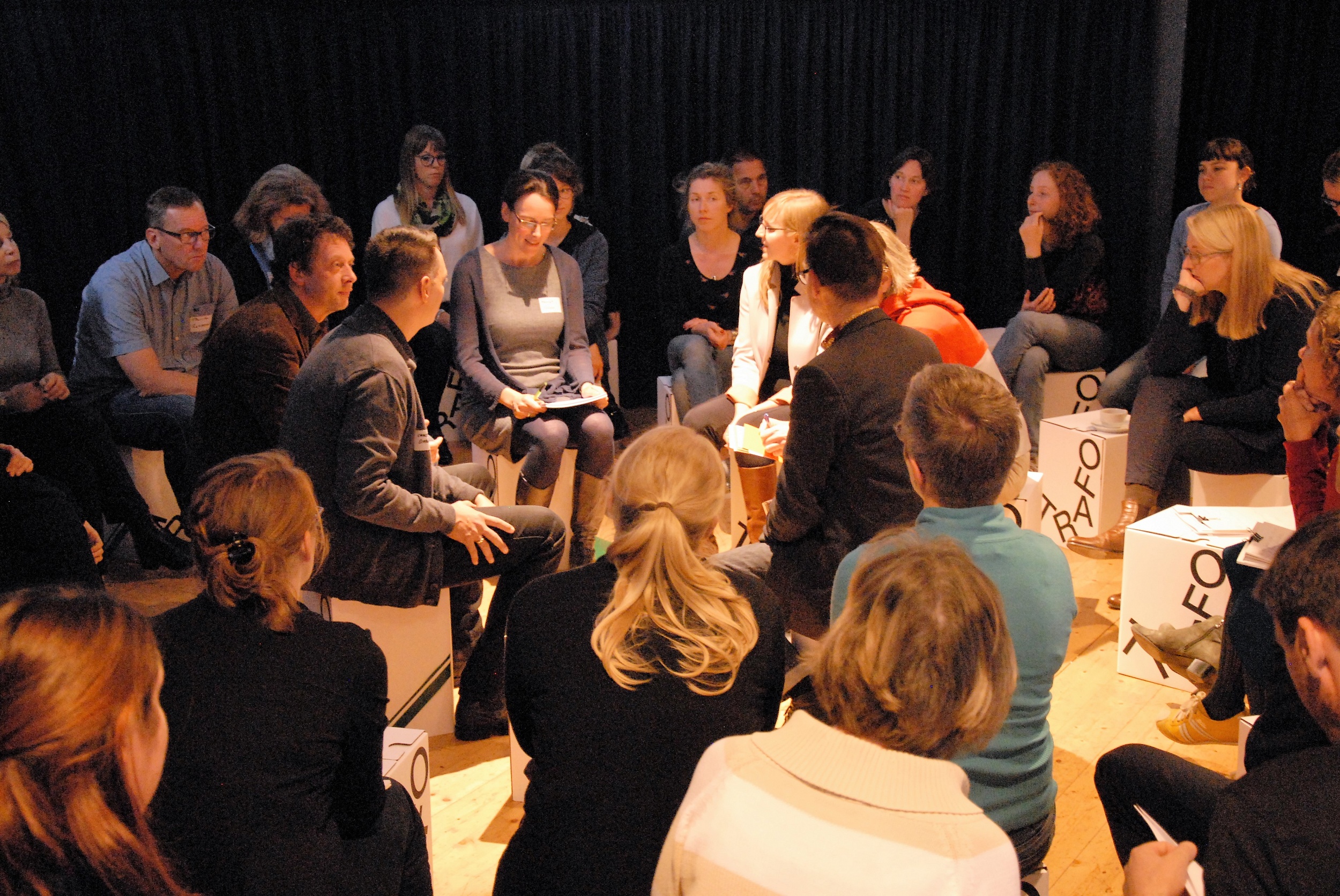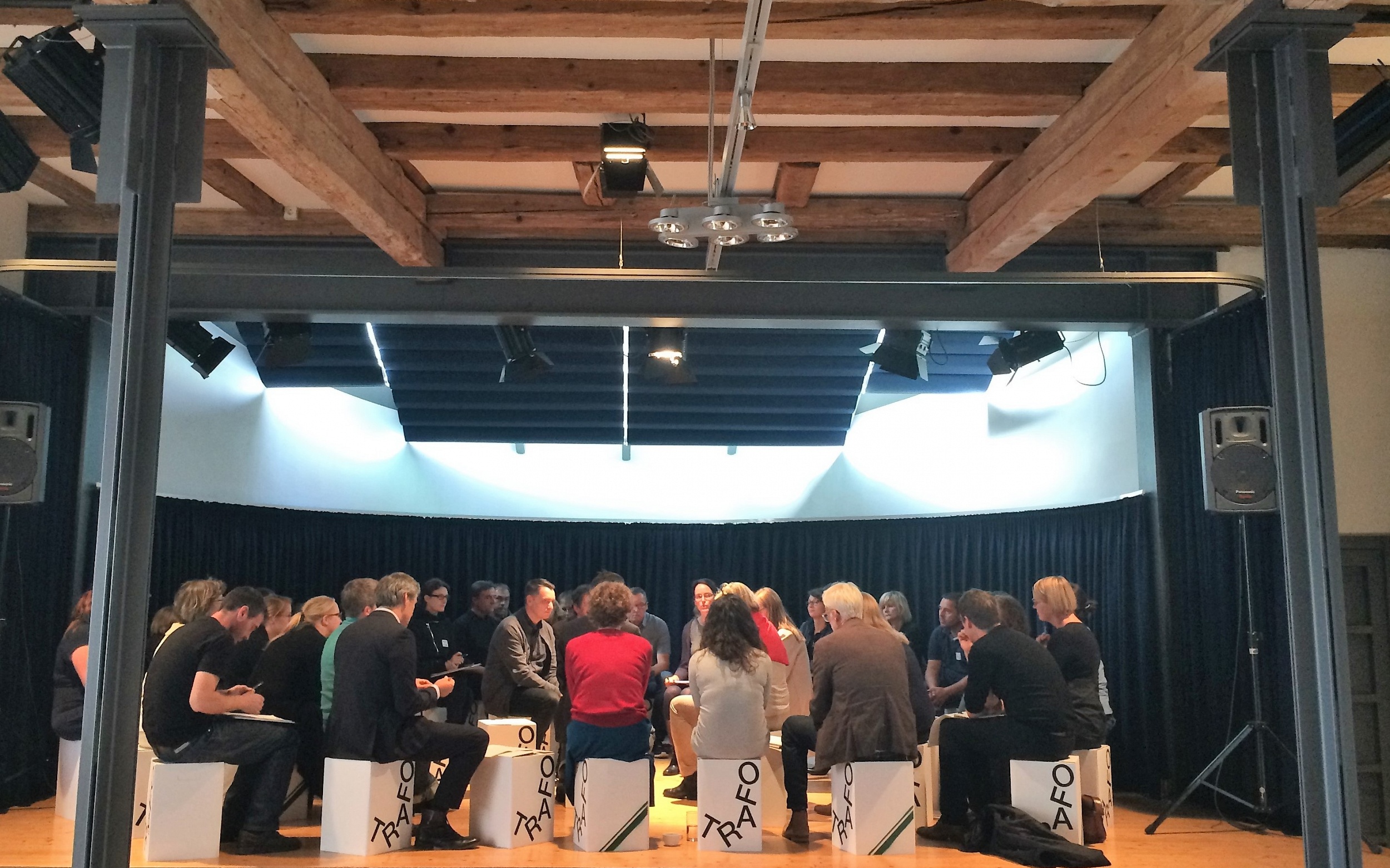 Im Anschluss diskutierten die Akademie-Teilnehmer mit Prof. Ton Matton (Raum & Designstrategien Kunstuniversität Linz), Prof. Dr. phil. Stephan Beetz (Soziologe, Universität Mittweida), der Künstlerin Dr. Susanne Bosch sowie dem freien Autor und Journalisten Christoph Schröder über die Herausforderungen von Kulturangeboten in ländlichen Räumen und kleinen Städten. In einem sogenannten Fishbowl-Format wurde darüber gesprochen, welche Geschichten in ländlich geprägten Räumen künstlerisch erzählt werden sollen. Betont wurde, dass die Beschreibungen und Geschichten der Kultur in ländlichen Regionen das Spezifische und Individuelle der jeweiligen Region in den Vordergrund rücken sollten. Zudem sei es notwendig, stärker die Träger ländlicher Kultur in den Blick zu nehmen, wie Landwirte, Handwerker oder Vereinsmitglieder. Aufgabe der Kultur sollte es sein, die Arbeit der Träger ländlicher Kultur sichtbar zu machen. Ein weiteres Anliegen der TRAFO-Partnerinnen war es, stärker darauf zu schauen, welche gesellschaftlichen Antworten nur der ländliche Raum geben kann. Was ginge einer Gesellschaft verloren, wenn es keinen ländlichen Raum mehr gibt? Die Potenziale des Landes sollten entsprechend dargestellt und die „Peripherie“ als Chance für die Zukunft hervorgehoben werden.