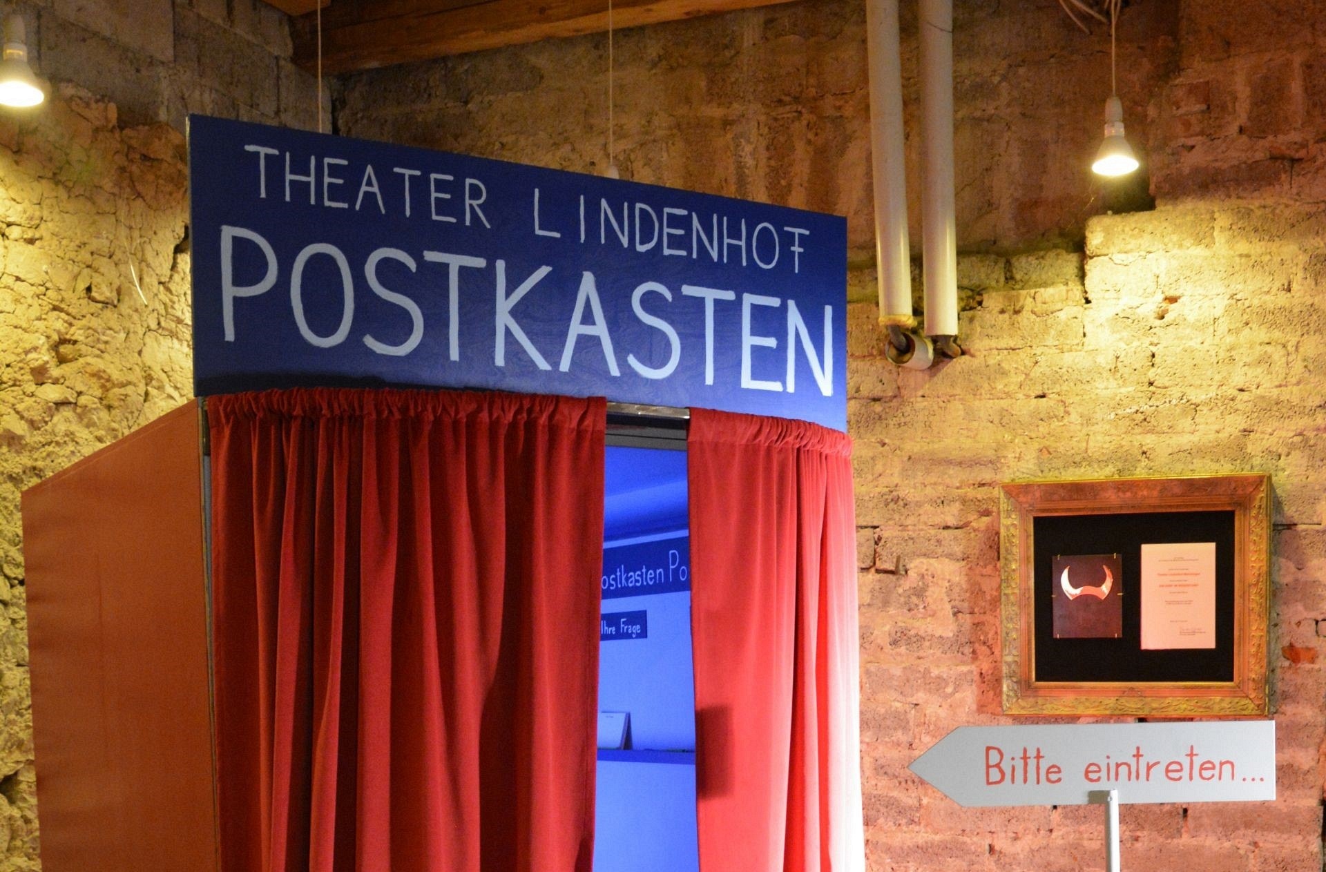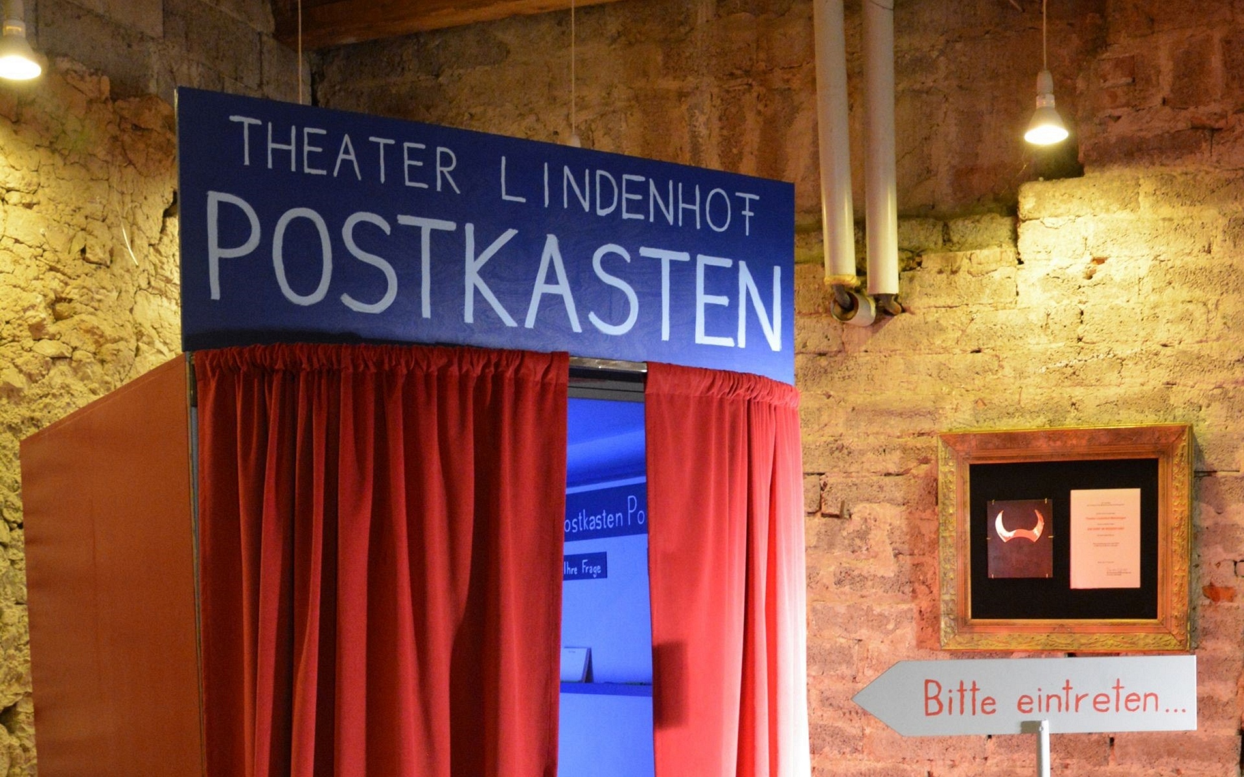 Der mobile Postkasten des Theaters Lindenhof sieht von außen ein bisschen wie ein Passfoto-Automat aus. Seine Nutzer öffnen einen roten Vorhang und stehen vor einem roten Buzzer. Darauf ein Pfeil mit der Aufschrift „Bitte drücken“. Der Postkasten ist für die Theatermacherinnen eine Möglichkeit, mit den Menschen aus der Region in Kontakt zu treten. Drückt man den Knopf, wendet sich der Intendant des Theaters an den Besucher und ermuntert diesen, die im Postkasten angebrachten Fragen zu beantworten oder eigene Fragen zu stellen.