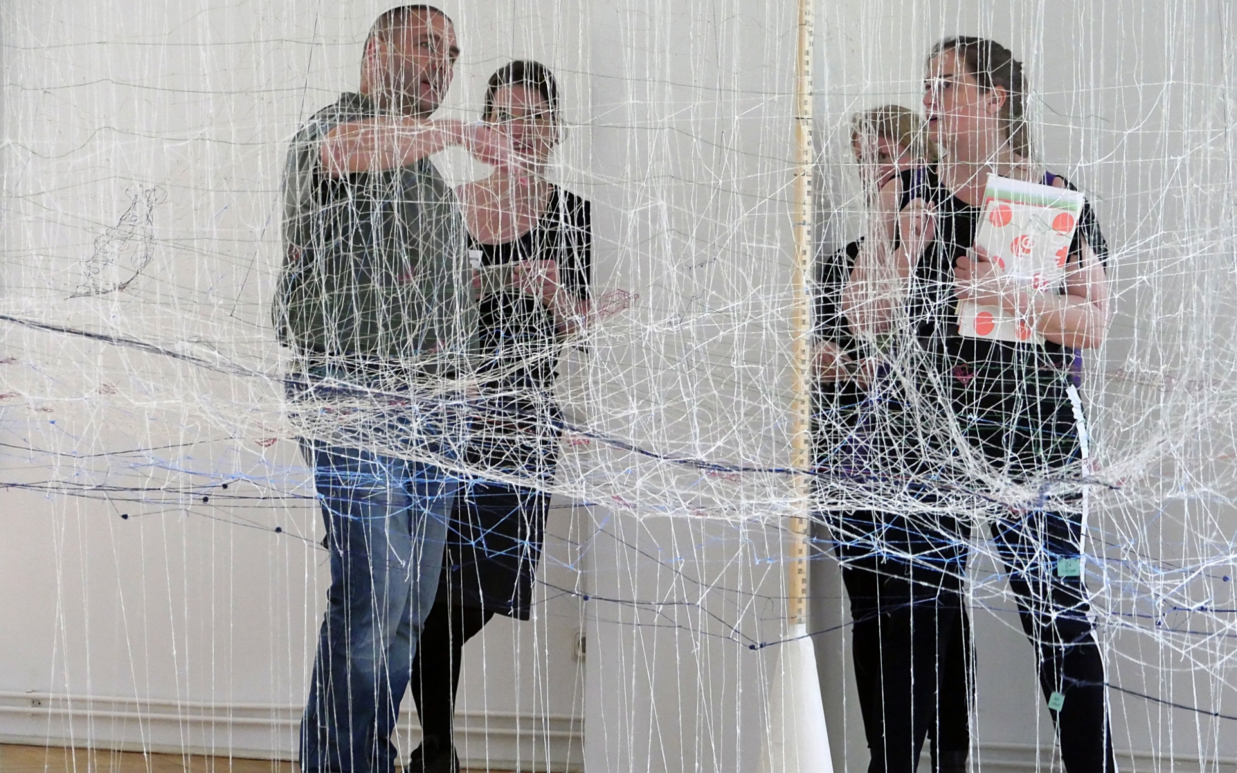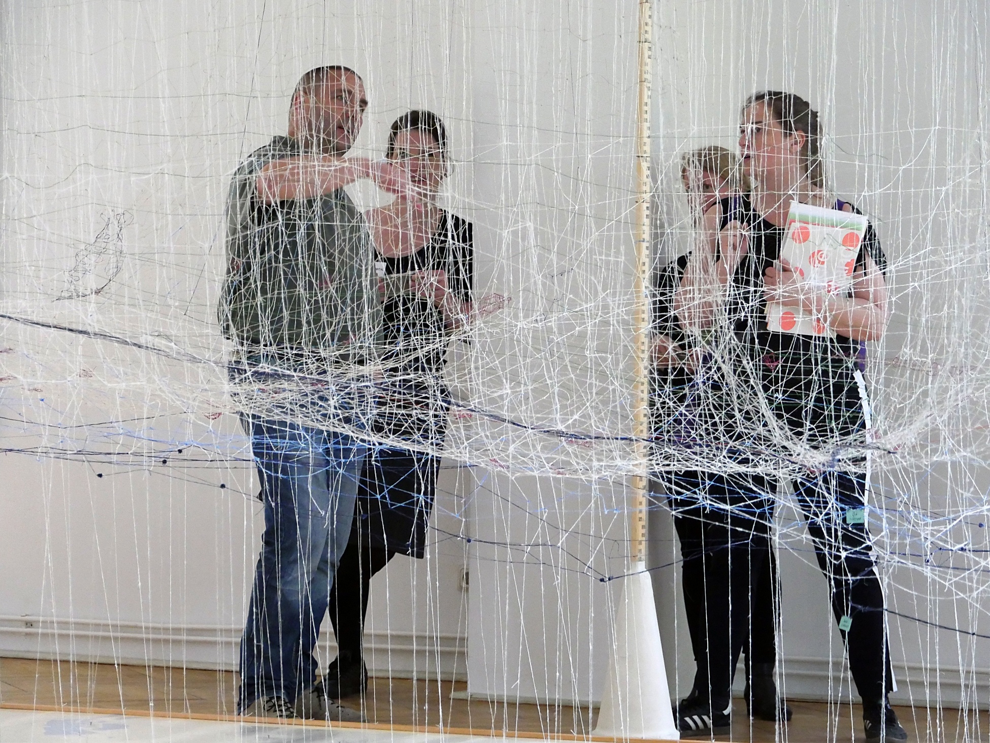 K: Ich würde Dich wohl zuerst zum Oderbruch-Gespinst von Antje Scholz führen, denn in diesem Objekt steckt ein Teil meiner eigenen Geschichte. Es ist eine Installation aus tausenden Fäden, die die topografischen und Wasserverhältnisse des Oderbruchs auf eine ganz feine Weise zum Ausdruck bringt. Wichtig hierbei ist zuerst der Stellenwert der Kunst: Sie ist freier und stärker als alle anderen Elemente unserer Arbeit im Museum (denn nicht alles, was wir tun, ist Kunst), aber dennoch eingebunden in einen räumlichen Kontext und verpflichtet auf die Kommunikation mit den Leuten. Allein dieses Verständnis birgt viele Konflikte, und es war für uns entscheidend, Künstlerinnen zu finden, die sich in verschiedenen Genres darauf eingelassen haben: Schauspieler, bildende Künstlerinnen, Fotografen und Designerinnen. Zudem steckt in dem Objekt auch die Auseinandersetzung mit der Professionalität, das Erkennen eigener Grenzen. Denn ausgehend vom Gespinst hat Antje Scholz sukzessive kuratorische Aussagen für alle Räume des Museums entwickelt. Das hätte ich nie gekonnt. Und schließlich markiert das Objekt auch den Moment in der Museumsentwicklung, an dem ich zum ersten Mal die Zuversicht gewann, dass die Transformation wirklich gelingen könnte. Weil es eine eigene Schönheit hat und weil es in seiner Fragilität und Durchsichtigkeit zulässt, dass alle anderen Dinge, die im Museum zu sehen sind, auch wahrgenommen werden können und nicht erstickt werden. Genau das brauchten wir für unser Vorhaben.