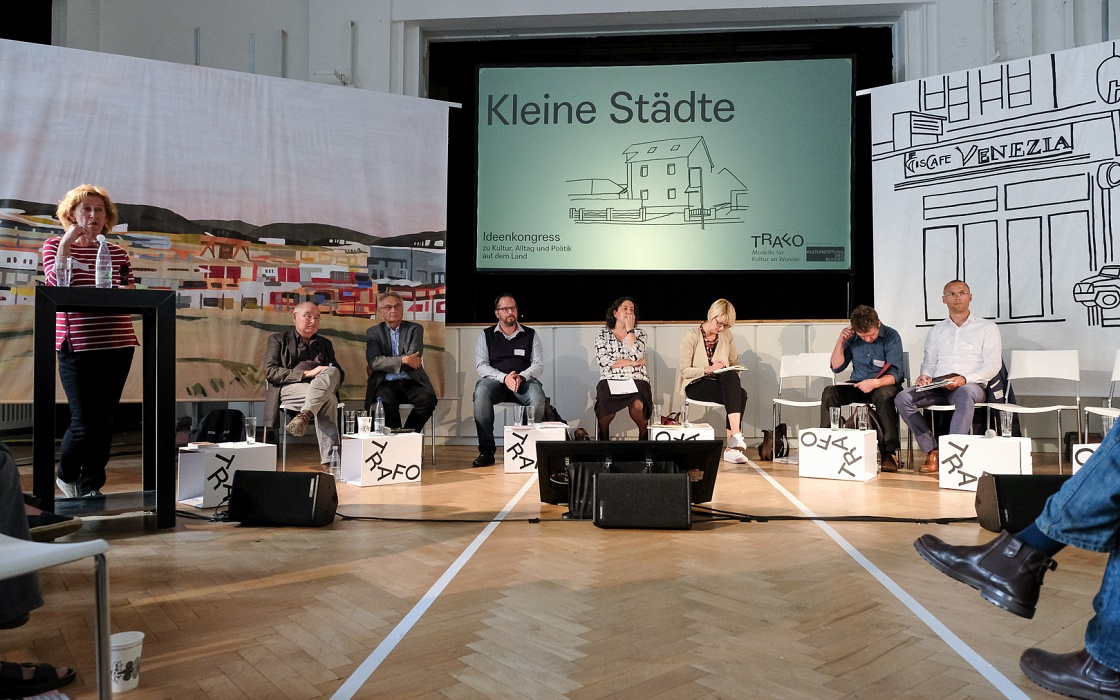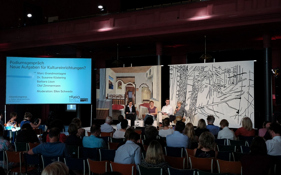 Das Herzstück des Ideenkongresses waren vier sogenannte Themenräume zu den Schwerpunkten „Neue Aufgaben“, „Perspektive Land“, „Kulturförderung“ und „Kleine Städte“. Gemeinsam mit Partnern wie der Kulturpolitischen Gesellschaft, der IBA Thüringen und dem Thünen-Institut für Ländliche Räume in Braunschweig wurden diese Themenräume entwickelt, die sich aus unterschiedlichen Perspektiven dem Land und seinen kulturellen Einrichtungen genähert haben.