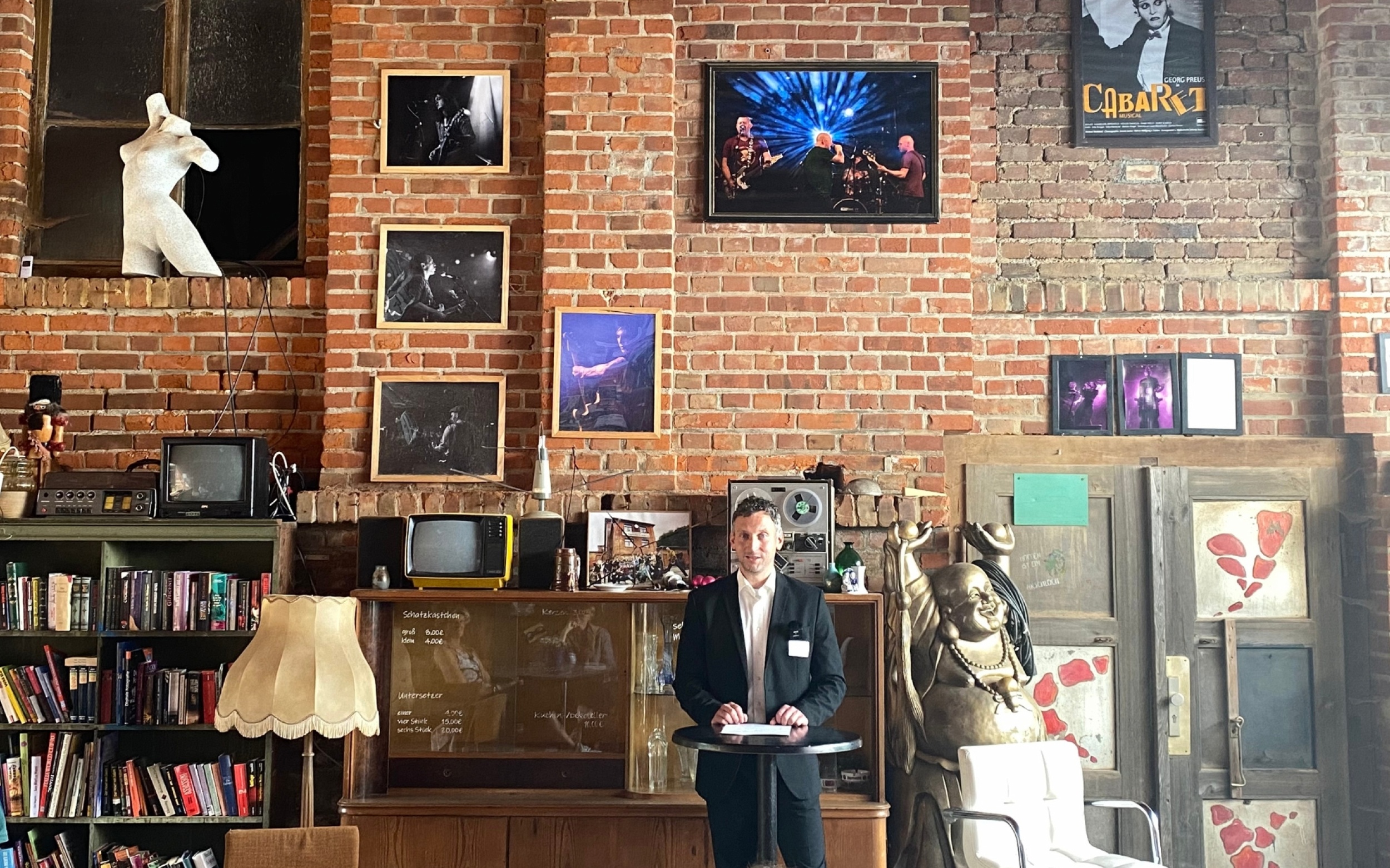 Im Anschluss besuchen wir den Pößnecker Alternative Freiraum e.V., kurz „PAF“, ein selbstorganisiertes Jugend- und Kulturzentrum das 2011 aus einer zivilgesellschaftlichen Initiative gegen das damals von Neonazis betriebene Schützenhaus entstanden ist. Inzwischen hat sich aus dem unscheinbar am Stadtrand gelegenen ehemaligen Leerstand ein intergenerationaler Zufluchtsort für Menschen aus Pößneck und ein überregional bekannter Veranstaltungsort entwickelt. Der PAF ist Safe Space, kultureller Freiraum und Anlaufstelle für Jugendliche, auch aus schwierigen Verhältnissen, wie uns Martin Rech, Vereinsvorsitzender erzählt. Der Verein engagiert sich zudem in der Demokratiearbeit und vernetzt sich mit Kulturaktiven der Stadt. Der durch bundesweite Auszeichnungen anerkannte Ort arbeitet daran, auch von der Stadt Pößneck selbst als wichtiger Akteur für Jugendliche wahrgenommen zu werden. Erfolgt eine finanzielle Unterstützung durch die Stadt, wäre eine dringend benötigte Sozialarbeiterstelle in Aussicht. Im Gegensatz zum Kulturkollektiv Goetheschule ist die Zukunft des PAF allerdings ungewiss, denn für die kommende Landesgartenschau 2028 soll das Gebäude abgerissen werden. Christian Horn, Kulturdirektor der Stadt Erfurt, plädiert für eine aktive kulturpolitische Arbeit des Freiraums, um die Stadt von der Notwendigkeit des Ortes zu überzeugen.