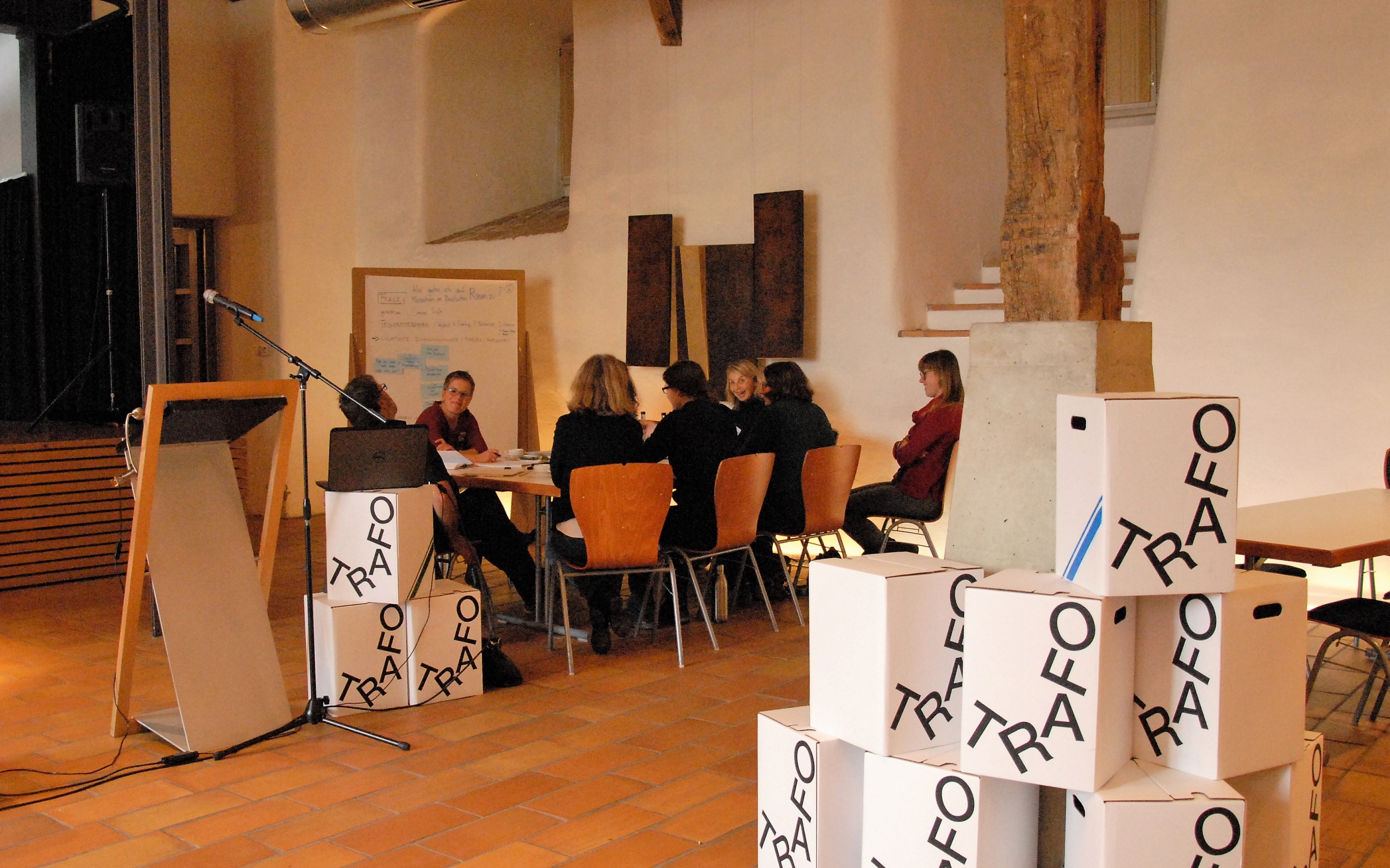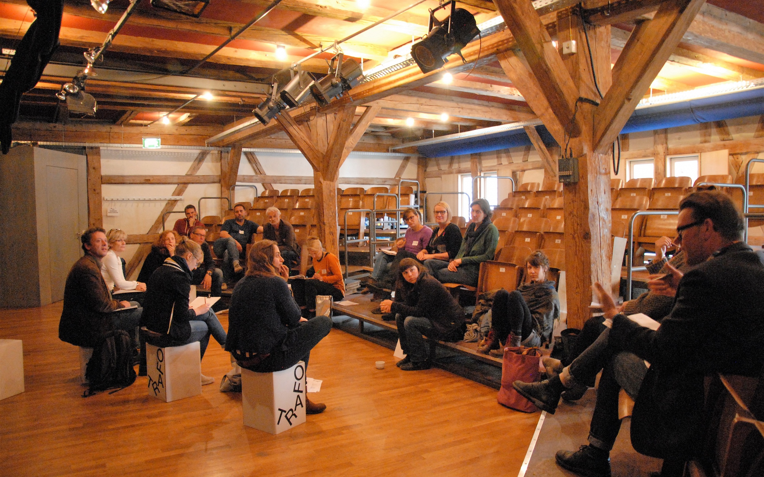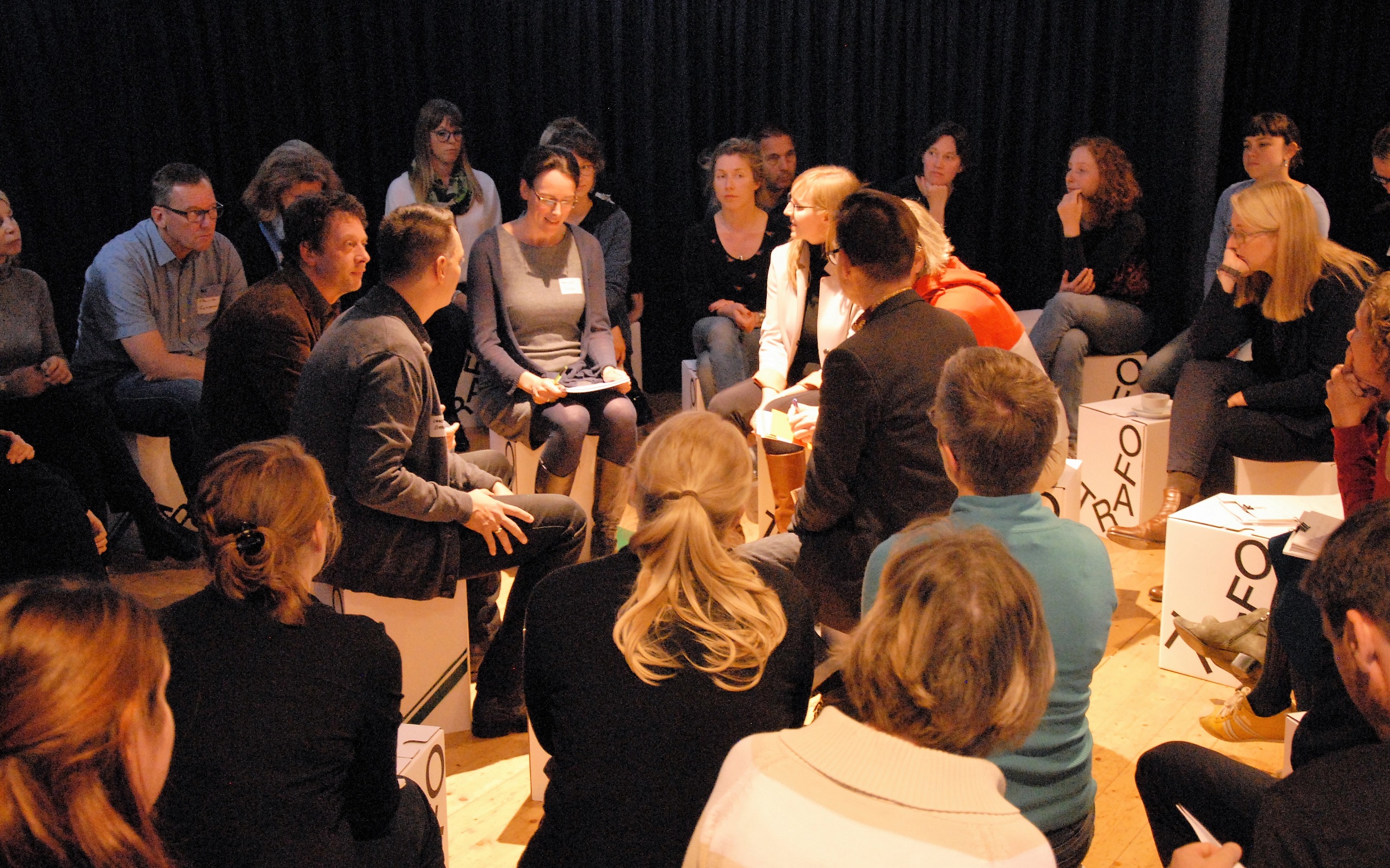 Im Anschluss diskutierten die Akademie-Teilnehmer mit Prof. Ton Matton (Raum & Designstrategien Kunstuniversität Linz), Prof. Dr. phil. Stephan Beetz (Soziologe, Universität Mittweida), der Künstlerin Dr. Susanne Bosch sowie dem freien Autor und Journalisten Christoph Schröder über die Herausforderungen von Kulturangeboten in ländlichen Räumen und kleinen Städten. In einem sogenannten Fishbowl-Format wurde darüber gesprochen, welche Geschichten in ländlich geprägten Räumen künstlerisch erzählt werden sollen. Betont wurde, dass die Beschreibungen und Geschichten der Kultur in ländlichen Regionen das Spezifische und Individuelle der jeweiligen Region in den Vordergrund rücken sollten. Zudem sei es notwendig, stärker die Träger ländlicher Kultur in den Blick zu nehmen, wie Landwirte, Handwerker oder Vereinsmitglieder. Aufgabe der Kultur sollte es sein, die Arbeit der Träger ländlicher Kultur sichtbar zu machen. Ein weiteres Anliegen der TRAFO-Partnerinnen war es, stärker darauf zu schauen, welche gesellschaftlichen Antworten nur der ländliche Raum geben kann. Was ginge einer Gesellschaft verloren, wenn es keinen ländlichen Raum mehr gibt? Die Potenziale des Landes sollten entsprechend dargestellt und die „Peripherie“ als Chance für die Zukunft hervorgehoben werden.