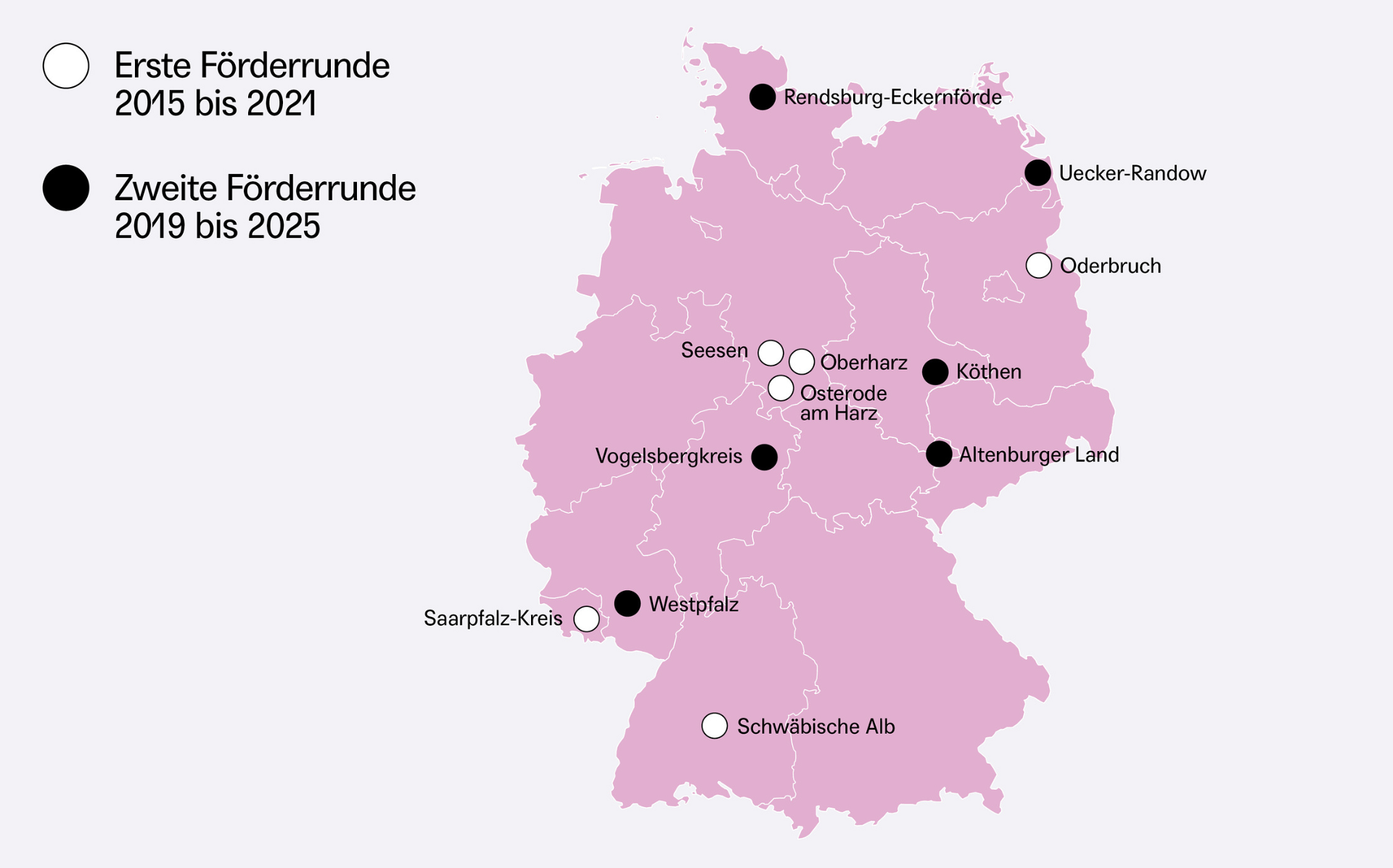 Von 2015 bis 2021 unterstützte TRAFO die Entwicklung und Umsetzung von Projekten in den Regionen Oderbruch, Saarpfalz, Schwäbische Alb und in Südniedersachsen. Von 2019 bis 2025 wurden in einer zweiten Förderrunde die Regionen Altenburger Land, Köthen, Rendsburg-Eckernförde, Uecker-Randow, Vogelsbergkreis sowie die Westpfalz gefördert. Diese sechs wurden aus deutschlandweit 18 Regionen ausgewählt, die TRAFO 2018 in einer einjährigen Entwicklungsphase bei der Erarbeitung eines Transformationskonzeptes unterstützte.